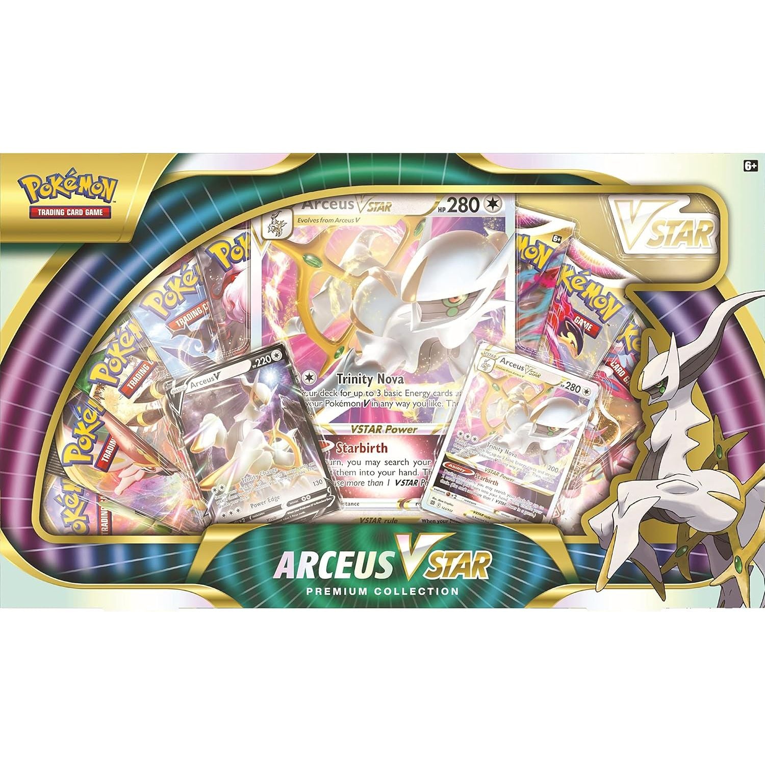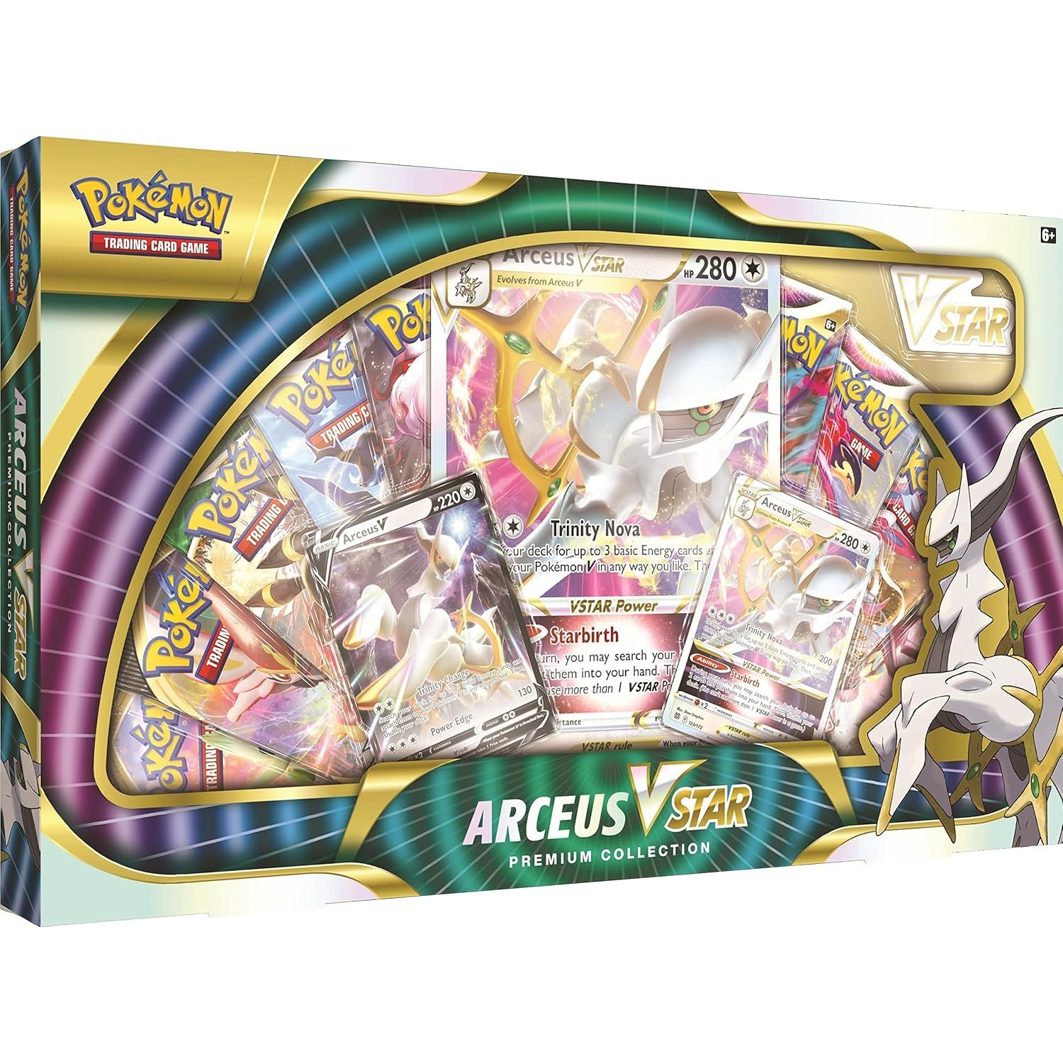 • Prémiová kolekcia Pokémon TCG: Arceus VSTAR obsahuje 1 leptanú fóliovú kartu s Arceusom VSTAR, 1 fóliovú kartu s Arceusom V a 1 nadrozmernú fóliovú kartu s Arceusom VSTAR.